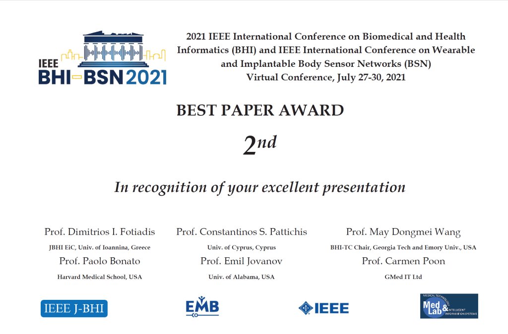 Best paper award (2nd Place),IEEE-EMBS International Conference on Wearable and Implantable Body Sensor Networks (BSN).