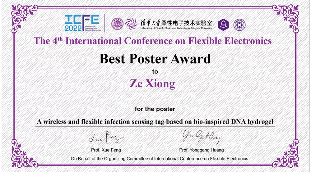 Dec. 2022 The poster “A wireless and flexible infection sensing tag based on bio-inspired DNA hydrogel” won Best Poster Award,The 4th International Conference on Flexible Electronics.