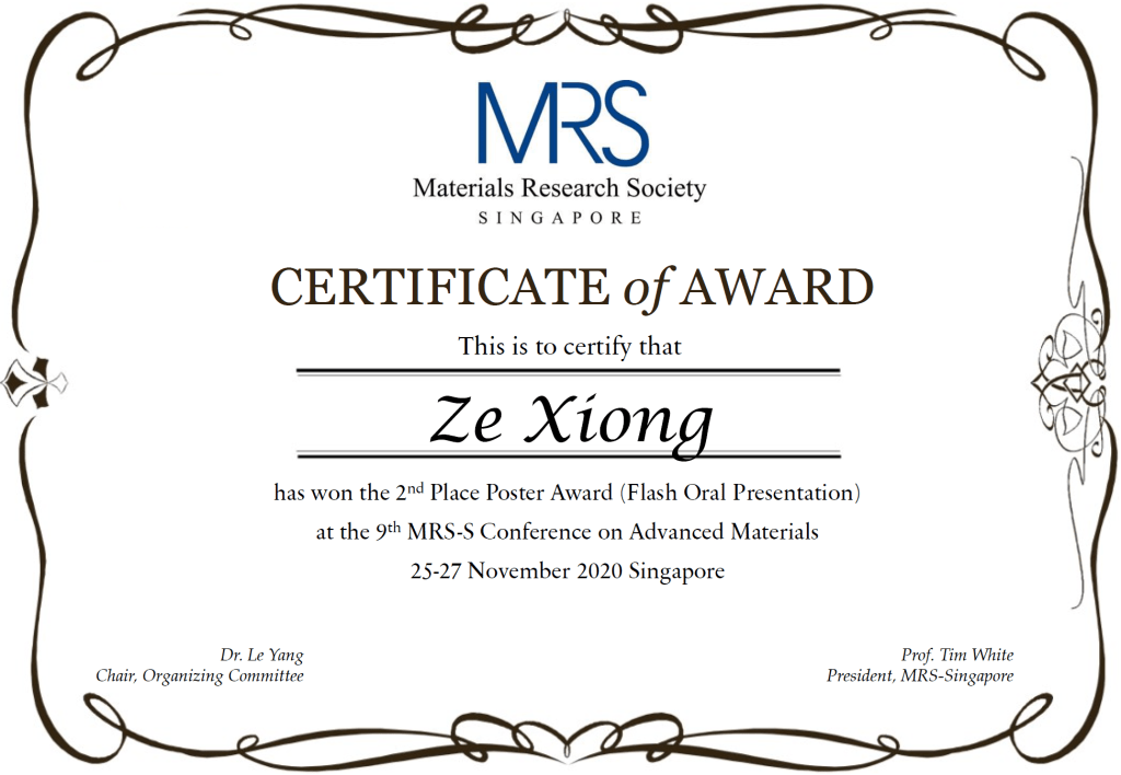 Nov. 2020 The oral presentation won Best Poster Award (2nd Place), 9th MRS-S Conference on Advanced Materials, 2020 (Selected as featured oral presentation , 3 out of 125 posters from MIT, Yale, Penn State, EPFL, ETH, NIMS, NUS, NTU, A*STAR, SUTD etc.)