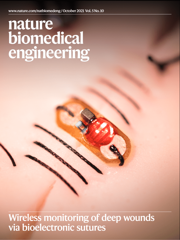 Oct. 2021 The work on wireless sensing (WiSe) sutures capable of directly monitoring deep surgical wounds was published by Nature Biomedical Engineering and selected as the cover work. News & Views, Nat. Biomed. Eng., Oct. 2021.